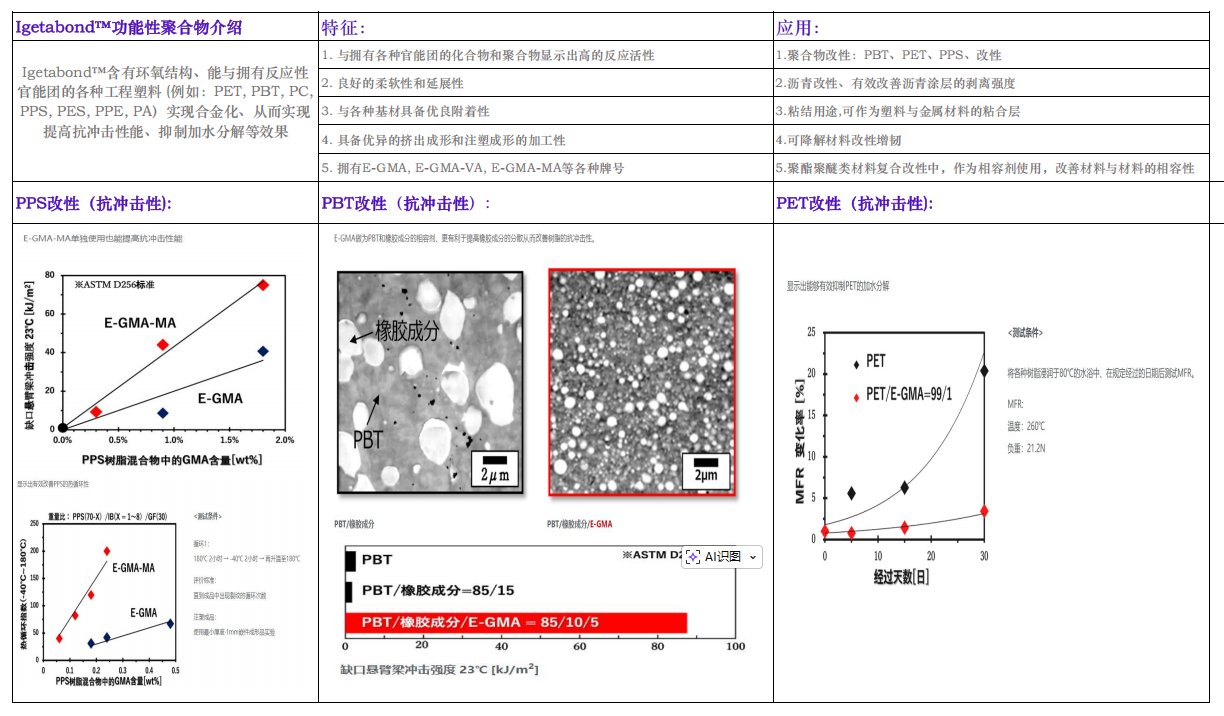 用途:作為反應型改性劑,添加2-10%有效地提高PBT/PPS/PET等工程塑料以及合金的抗沖擊強度以及熱疲勞性能。此外,還可以用來熱粘結各種塑料和金屬等材料的用途。
