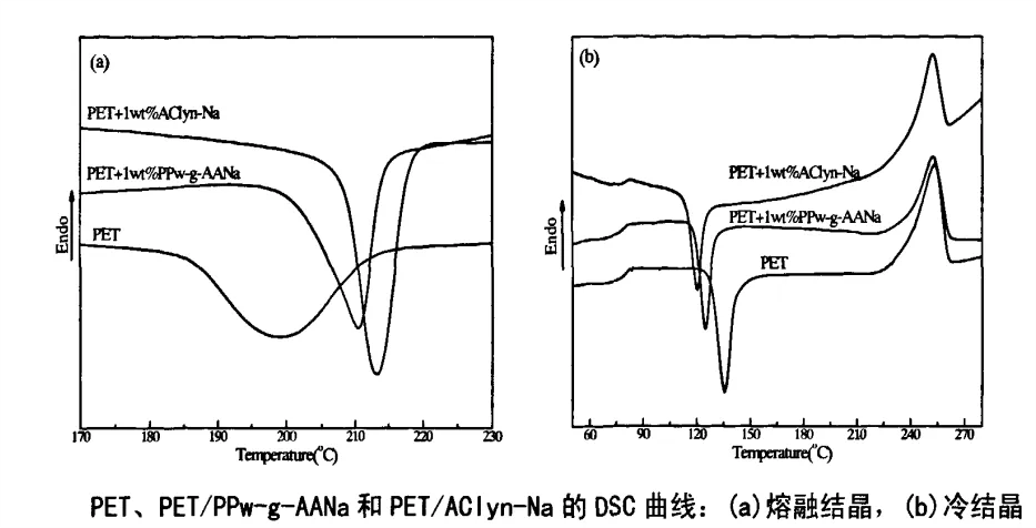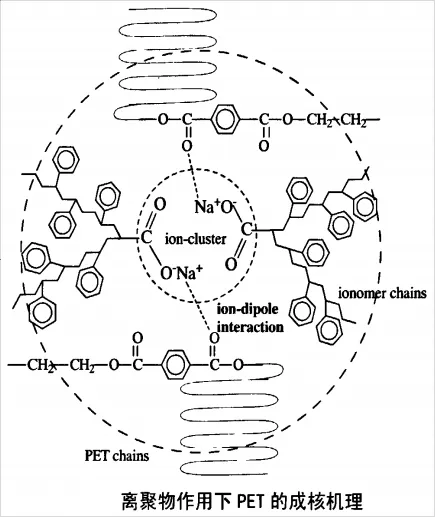 AClyn 285P與PET幾乎不發生化學反應,但PET/AClyn 285P體系擁有較好的相容性說明AClyn 285P的離子聚集體與PET的酯鍵間有離子-偶極作用的存在。AClyn 285P正是通過這種離子-偶極作用誘導了PET鏈段在其離子聚集體周圍進行排列形成晶核,進而促進結晶。